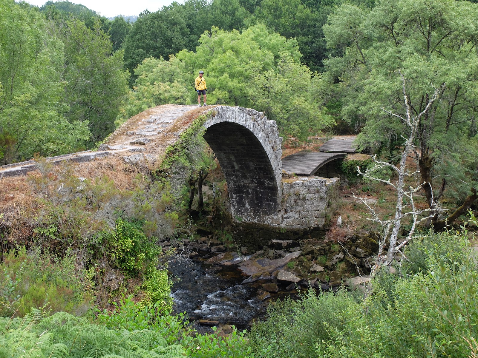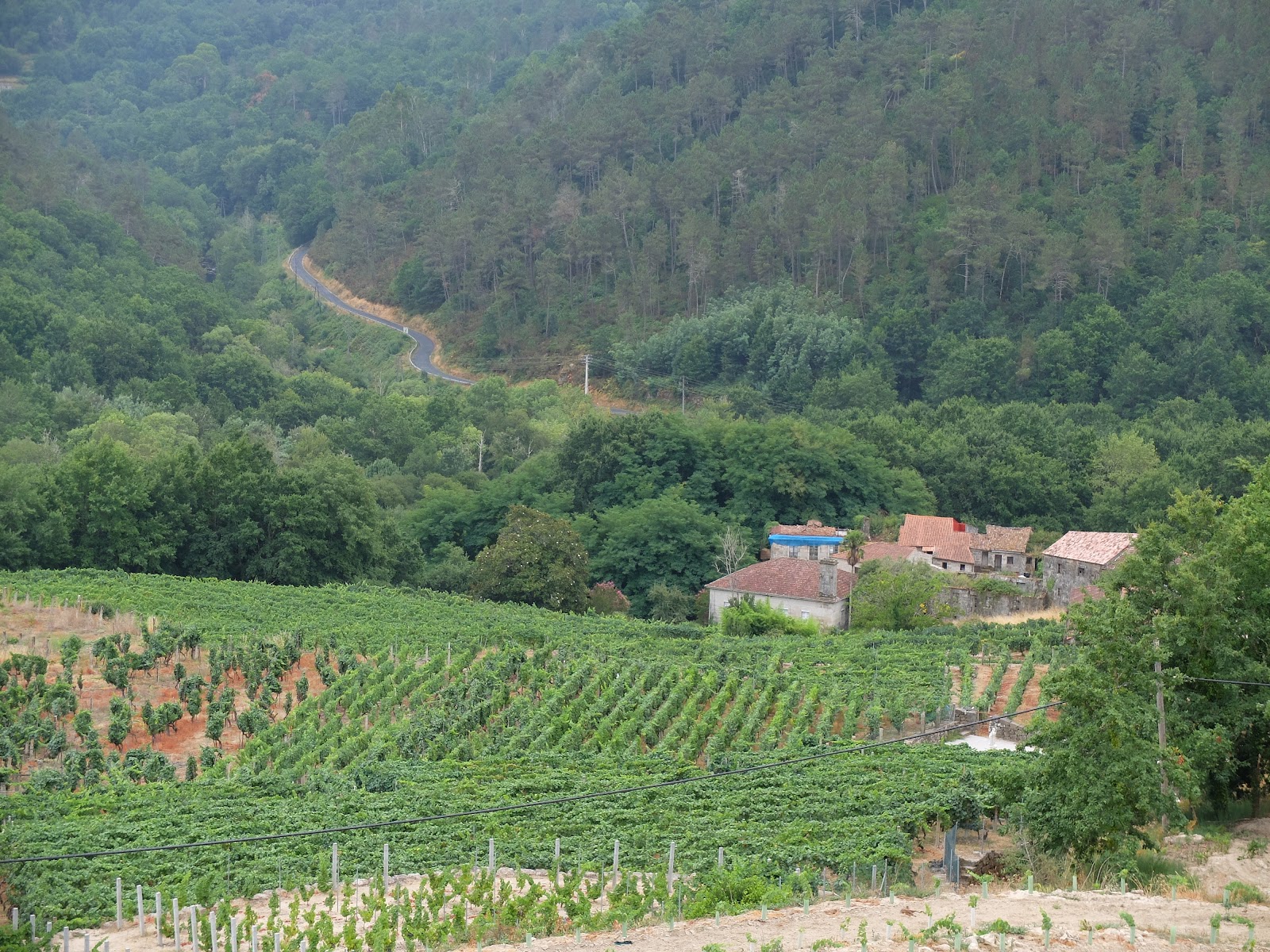 It turns out there is much more to discover in Galicia after the Camino to Santiago is finished. Galicia is a verdant garden of Eden. Unfortunately there is a reason for that green lushness: rain. It has been a bit wet the last two days but our trusty Pocket Earth app delivered wonderful routes that wound up to ridges far above the deep valleys and hills below. I am completely knackered from all the climbing, but the last 15 kms today were a great pay off. We traced a lonely serpent of asphalt, plunging through mature forests and down through terraced fields and vineyards and tiny hamlets clinging to the valley walls. It seems somewhat out of place in the wild landscape, but we are now in the Ribiero wine producing region. We had a pleasant bottle of a local white wine with our menu del dia today.